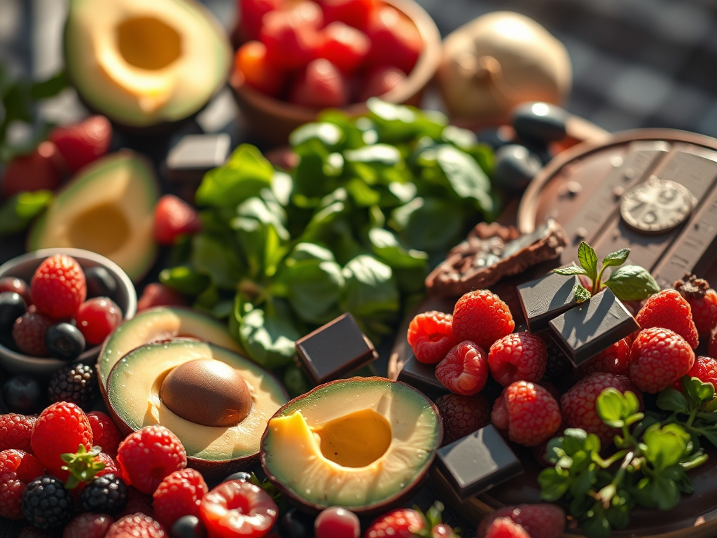 | Antioxidants | Fight skin aging | Berries, dark chocolate, spinach |